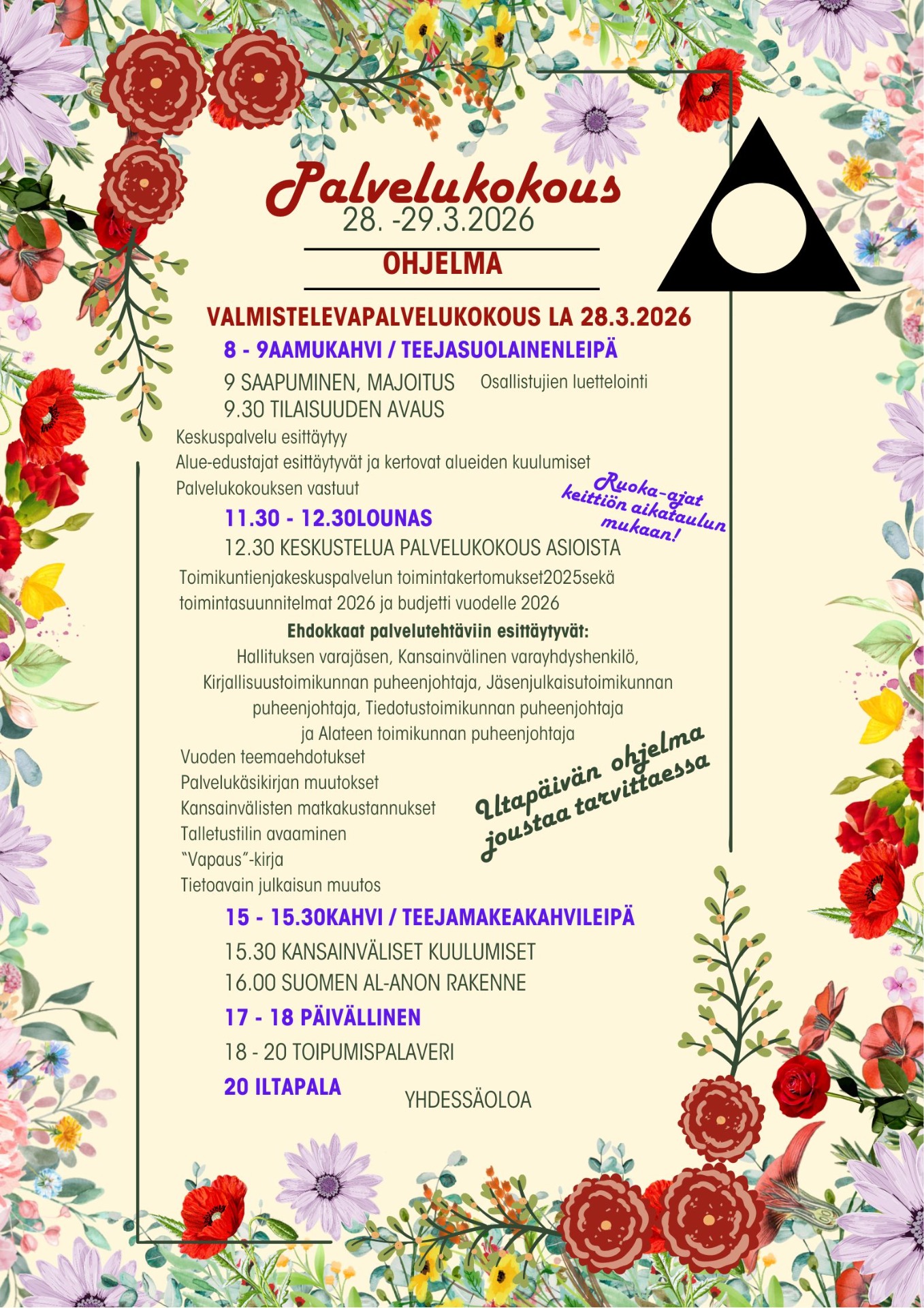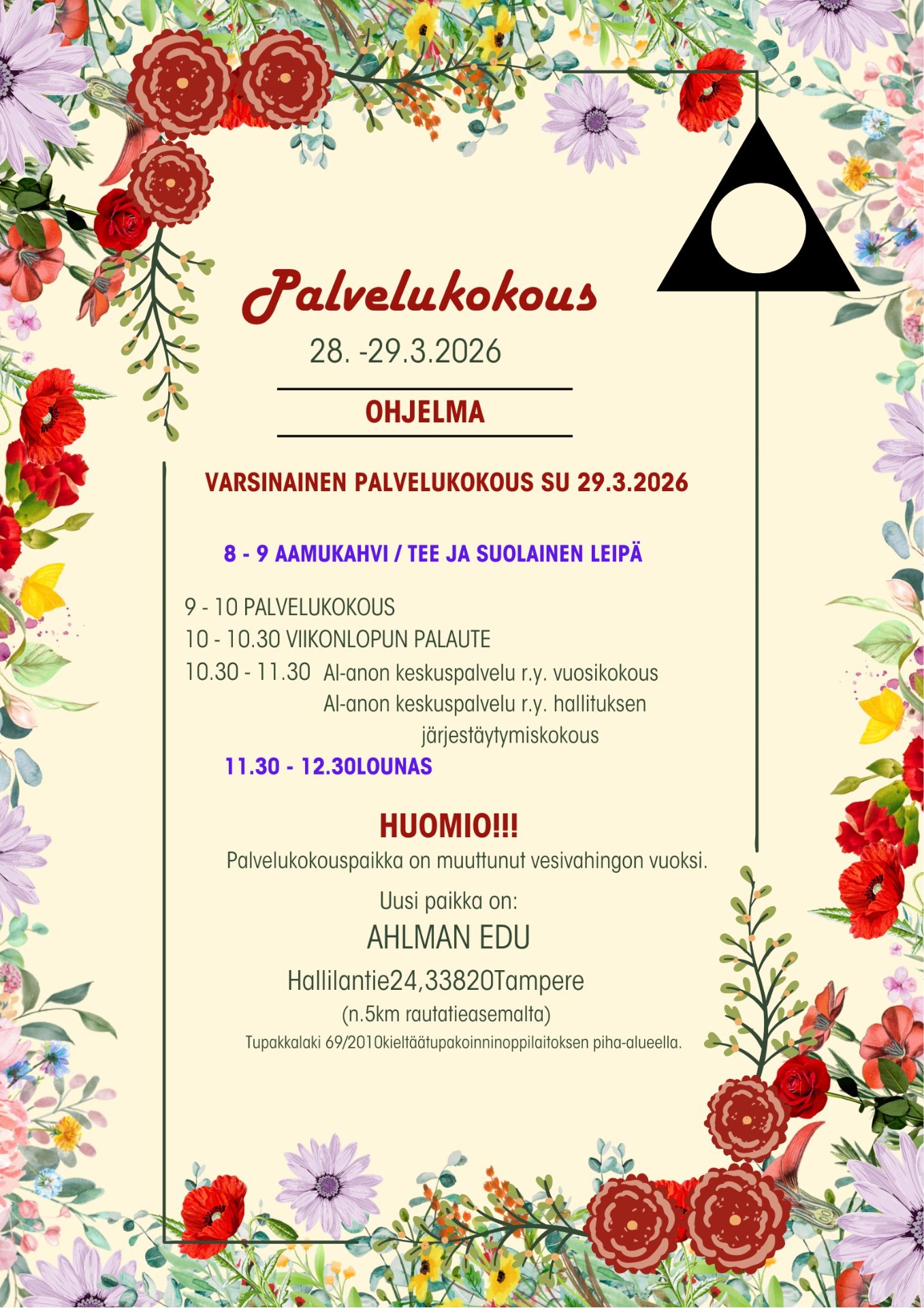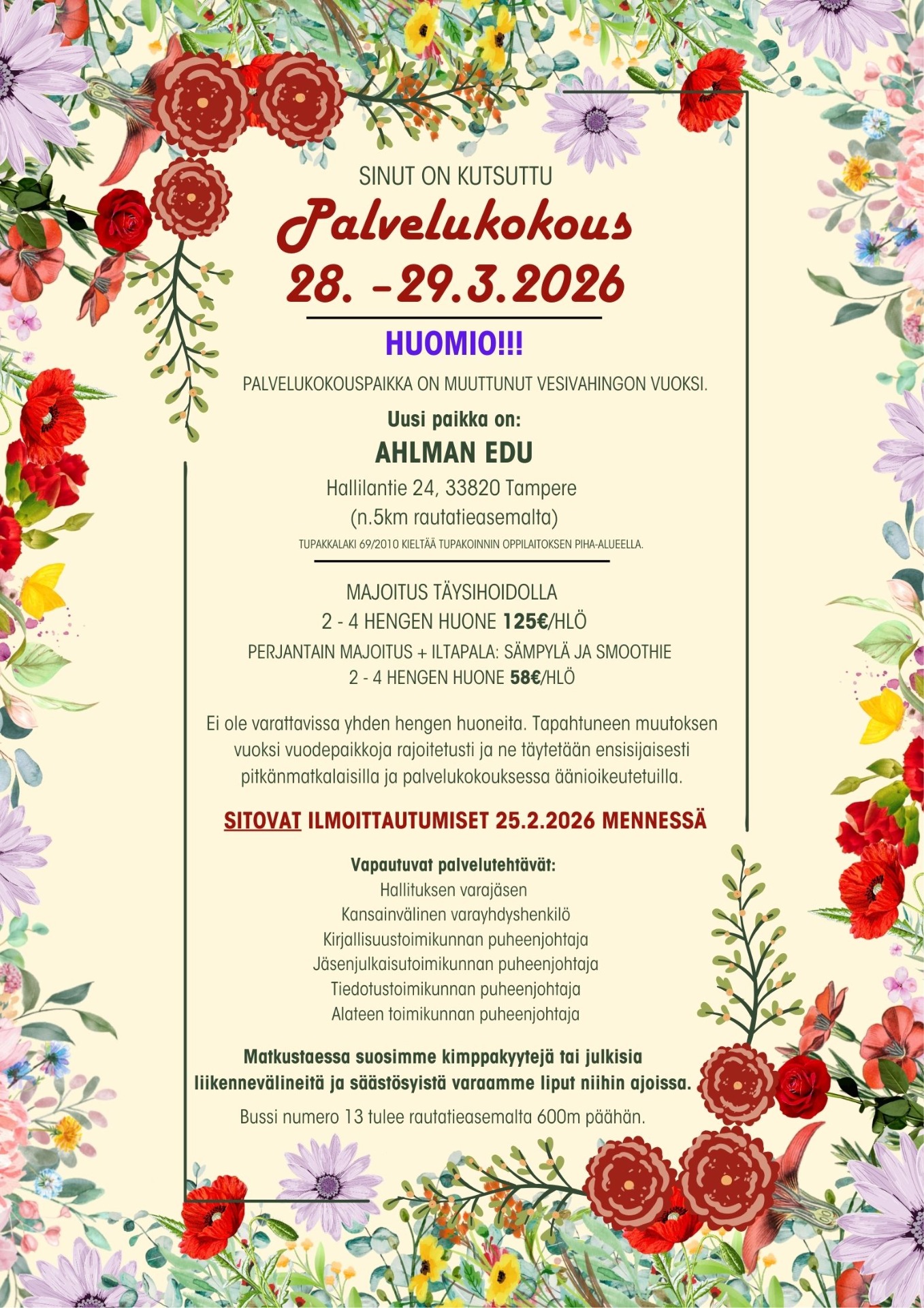 Palvelukokous pidetään 28.-29.3.2026 AhlmanEdussa Tampereella (Hallilantie 24). Tampereen Rautatieasemalta hyvät bussiyhteydet perille asti. Vesivahingon takia kokouspaikka on muuttunut.