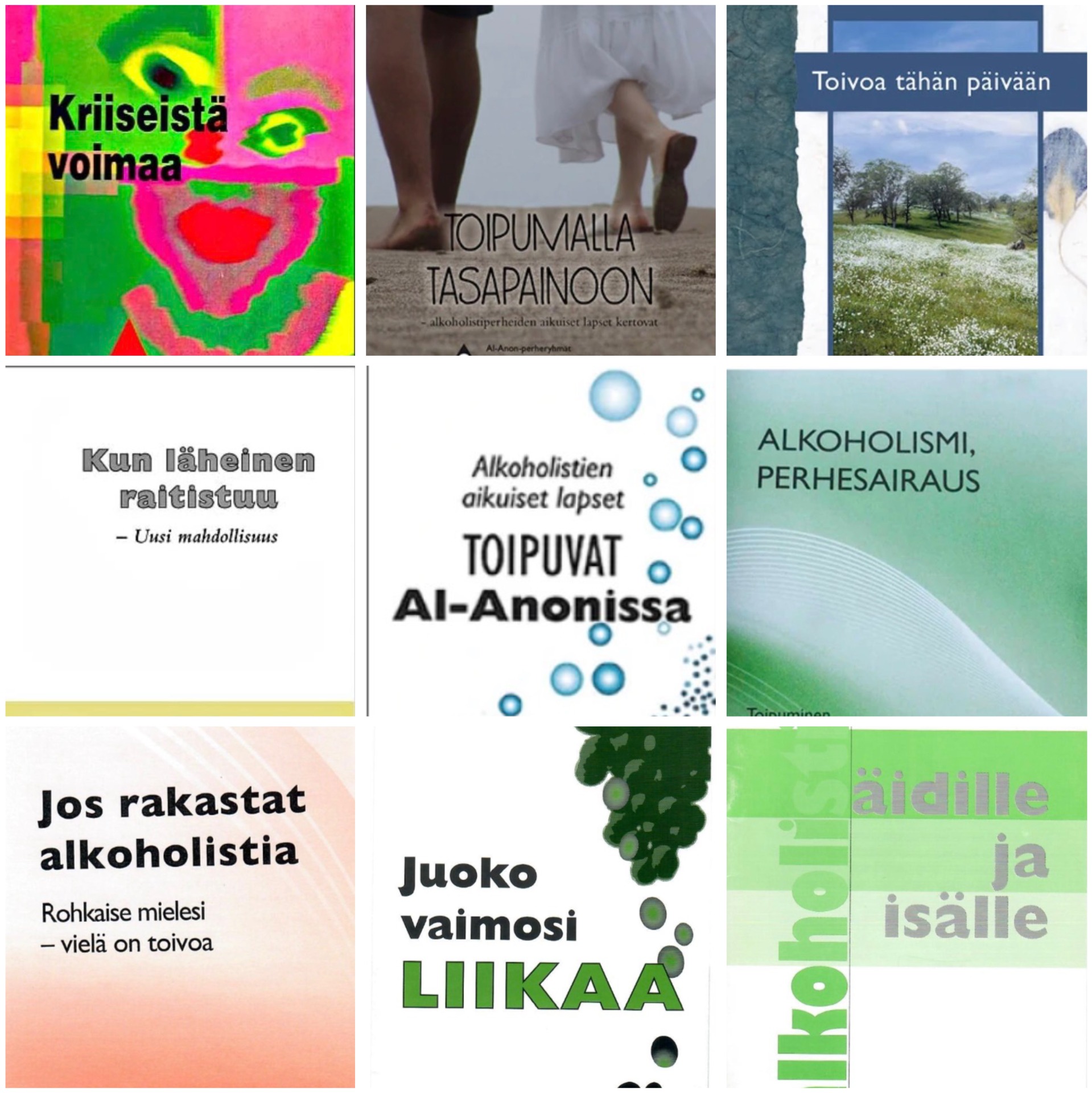 Paketti sisältää kirjat Toipumalla tasapainoon ja Kriiseistä voimaa sekä esitteet/vihkoset Kun läheinen raitistuu, Alkoholistien aikuiset lapset toipuvat Al-Anonissa, Alkoholismi-perhesairaus, Jos rakastat alkoholistia, Juoko vaimosi liikaa, sekä Alkoholistin äidille ja isälle.